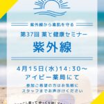 2026年3月9日 / 最終更新日 : 2026年3月9日 美穂荒井 健康フェア 第37回 薬と健康セミナー(紫外線) 春になると気をつけたいのが紫外線。 4月の薬と健康セミナー、アイビー薬局では 「紫外線」についてお話しします。 お気軽にご参加ください。