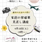 2026年3月9日 / 最終更新日 : 2026年3月9日 美穂荒井 健康フェア 第37回 薬と健康セミナー(常備薬) 春になり、GWも近付き、旅行の計画を立てている方もいるのではないでしょうか? 4月の薬と健康セミナー、薬局あこーれでは 「家庭の常備薬 見直し講座」を開催いたします。 常備薬はあるけれど、これって子供に使えるの?? 何を […]